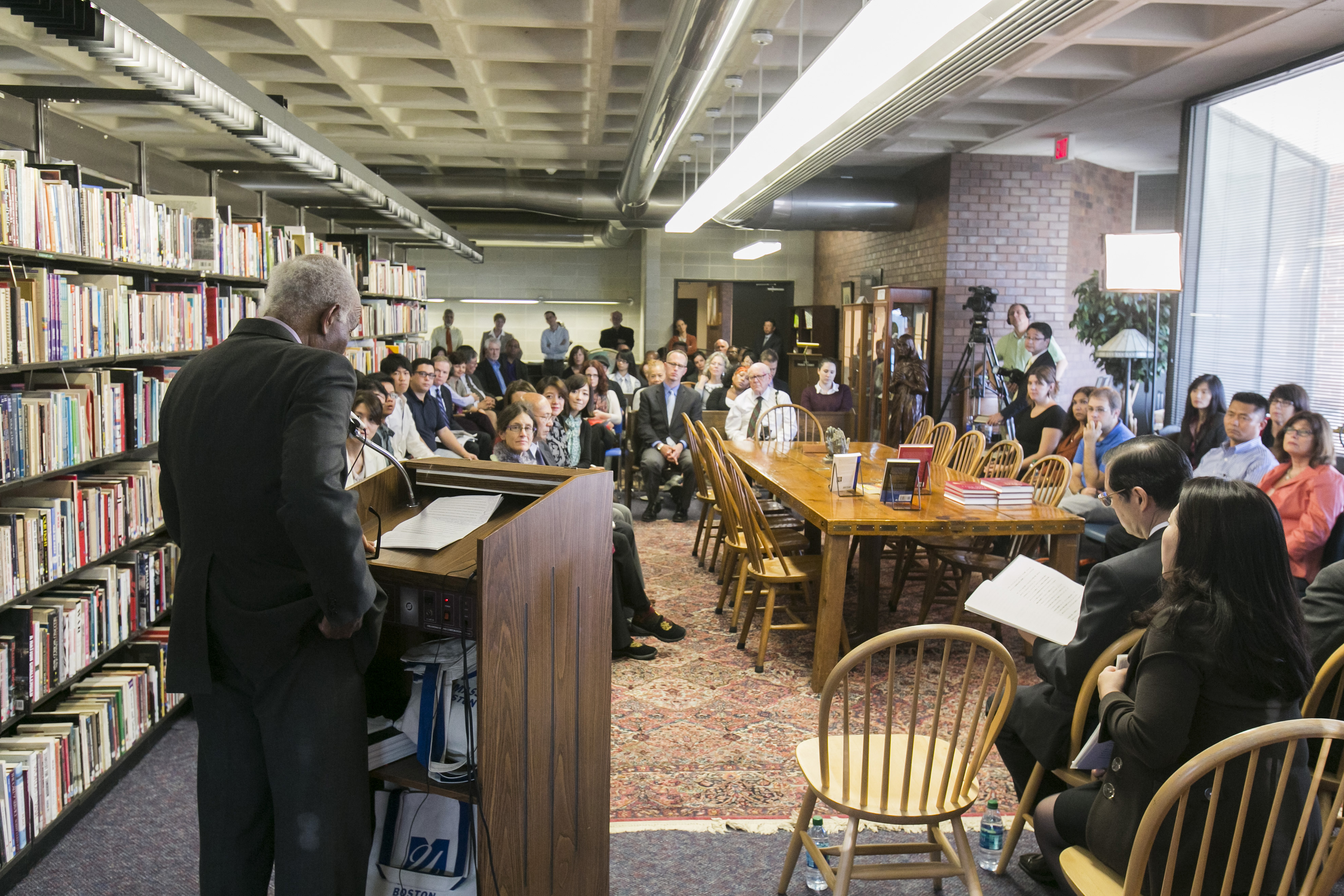 On the Monday following the September 28th twentieth anniversary event, Mr. Hiromasa Ikeda, Dr. Qu Delin, and members of the Ikeda Center staff went to the University of Massachusetts Boston to attend the official opening of the peacemakers table, a key component of the Peace Abbey Archives, which were donated in 2012 to the university’s Center and Archives for Peace, Social Action, Public Policy, and the Arts.