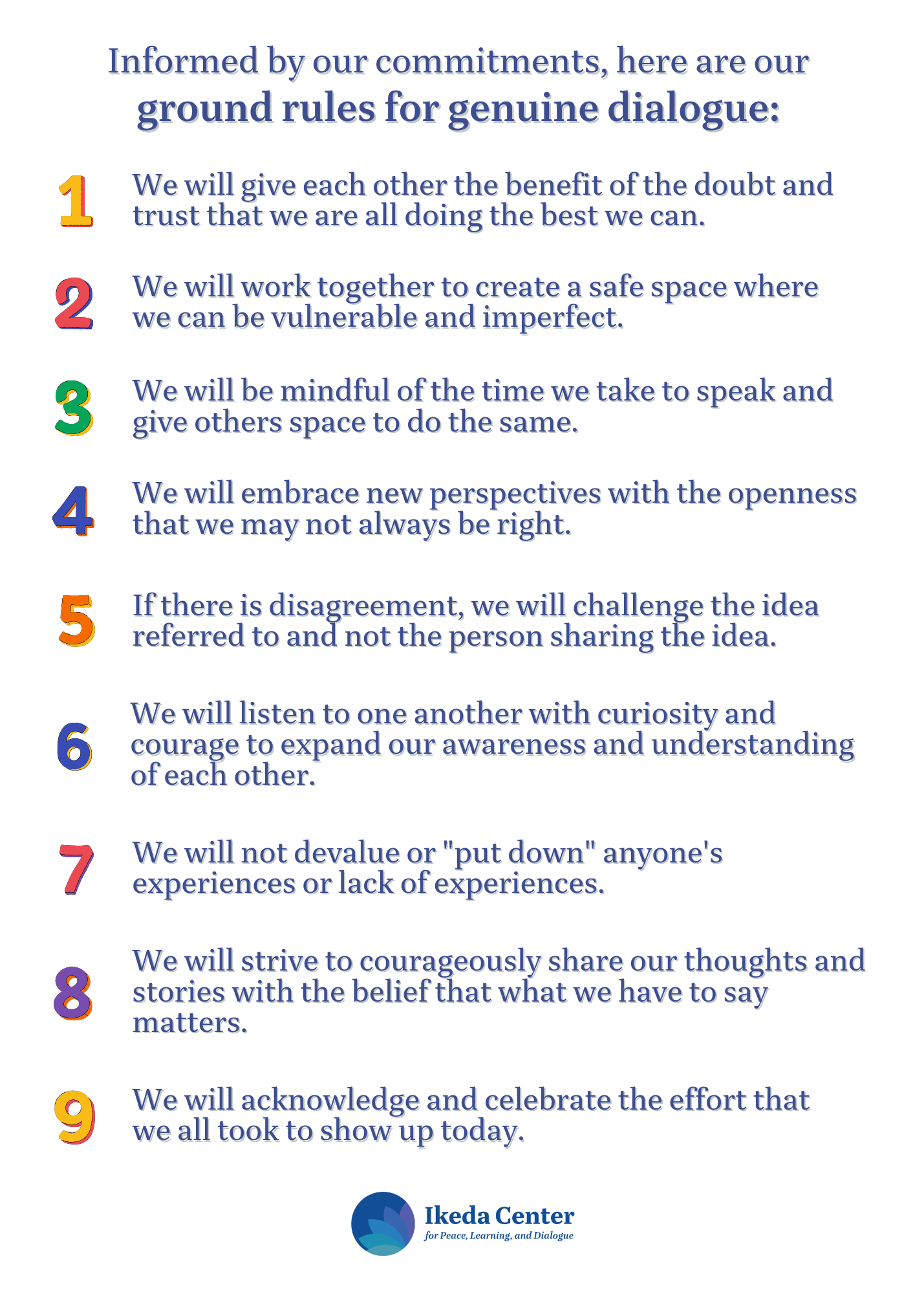 April 2024: We are pleased to share our NEW ground rules for genuine dialogue which are informed by our Center’s dialogue commitments. We invite you to download the graphic below: